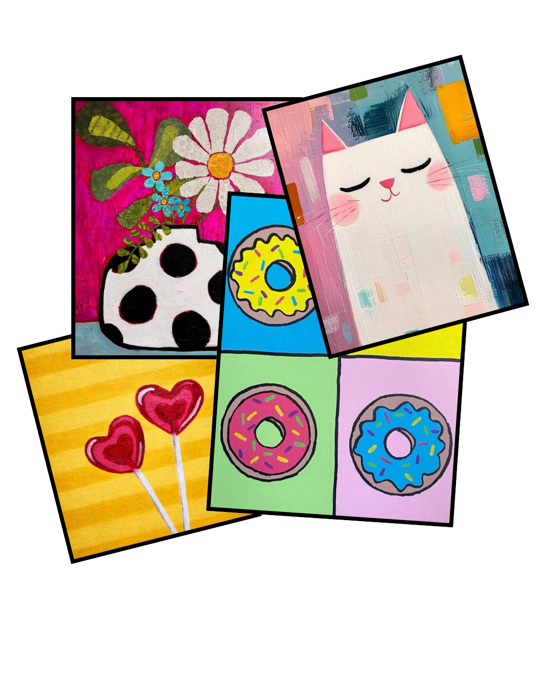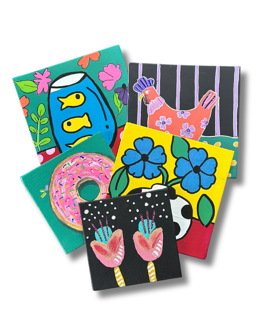 This is not your average paint-and-sip. Everyone works from a shared theme, but no two paintings come out the same. Expect mini canvases (4x4 or 8x8), lots of encouragement, and zero pressure to “get it right.”